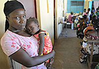 コンゴ民主共和国が行っている無料マラリア治療が受けられる保健センターのひとつで、診察を待つ親子。 |