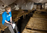 | カイナ町にある栄養補給センターの病床に座るミア・ファローユニセフ親善大使。このセンターは、数週間前に反政府勢力に襲撃され、医療品、食糧、マットなどを奪われた。 |
