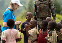 | カンヤバヨンガの国連平和維持軍 護衛の下、子どもたちと話すファロー大使。 |