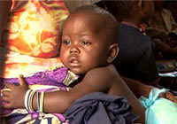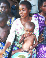 | コンゴ民主主義人民共和国北東部の保健センターを訪れた子どもと母親。このセンターは、ユニセフとNGOが展開するコミュニティでの栄養不良対策の一環として設置された。 |