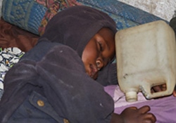 | 北キブ州のムグンガ国内避難民キャンプで眠る子ども。武装勢力とコンゴ民主共和国国軍の戦闘により、この数週間で、北キブ州内では数千人が避難を余儀なくされた。 |