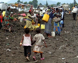 | 難民キャンプで子どもたちも水汲みや配給の列に並び、家族の生活を支えている。子どもたちは守られた環境で子どもらしく学び、遊ぶことが保障されておらず、子どもとして受けるべき権利が徹底されていない。 |