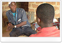 | ユニセフ子ども保護官フランシス・ザコに、武装勢力から集団に加わるよう金で誘われた経緯を話す17歳のリゴベール(カメラを背に映っている青年)。 |