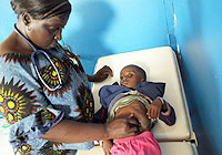 | コートジボアールのカニにある病院で、マラリアと気管支炎に苦しむコウアディオ・コウアディオちゃん(6歳)を診察するアリザタ・カボレ医師。 |