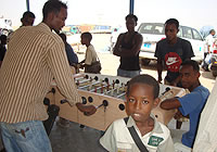 | ジブチ市郊外PK12地区のHIV啓発センターの近くで、テーブル・フットボールをする若者と男の子。 |