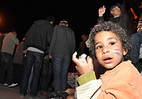| エジプトの首都、カイロのタハリール広場で、デモの群集に加わる子ども。 |