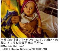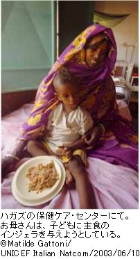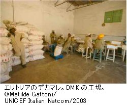 栄養不良の子どもたちは、ユニセフの支援で治療用の栄養強化ミルク(F75とF100)の提供を受けています。また、多くの母親たちも慢性の栄養不良で治療を受けています。ユニセフは、ハガズのこのセンターと別の20のセンターにも栄養強化ミルクを支給し、そのほかの物資や医薬品も提供しています。ユニセフはDMK(デュラ、ミルク、ヒヨコマメの調合品=エリトリア版の栄養補給食ユニミックス)の地元工場デカメレでの製造を支援しています。