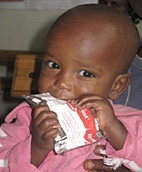 | ツゥラ保健センターでプランピー・ナッツ(Plumpy'nutR)を食べるネスサ・マソス君(1歳)。6月下旬にセンターに来たときの体重は6キロでしたが、ユニセフが支援している栄養補給食品のおかげで、8月半ばには、1.5キロ増加しました。 |