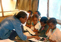 ウェニシェちゃんの教室は、彼女のお父さんがビニールシートと木の枝を使って建てた小屋の中で行われていました。自分を囲むように座った子どもたちの前で、ウェニシェちゃんは、「子どもから子どもへ」アプローチ・プロジェクトの教材を使って、一週間の研修で学んだ活動を子どもたちに教え始めました。