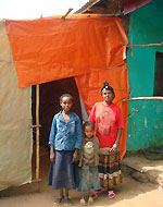 | ウェニシェちゃんが子どもたちを教えている小屋の前に立つ、ウェニシェちゃん(左)と母親のマサラットさん(右)、妹のインナットちゃん(中)。 |
