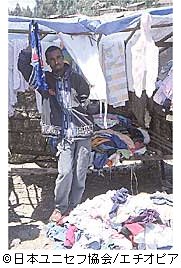 アムハラ州デセ市の市場で中古衣料を売る18歳の青年アンドリアス君。アンドリアス君も、エリトリアから逃れてきた避難民の1人です。紛争によって両親を失い、妹3人を連れて戦火の中を逃げ惑い、わずかな生活用品を持って、国境から数百キロを歩いてデセにたどり着きました。