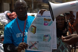 | ユニセフはコナクリでエボラ出血熱の発症を防ぐための啓発活動を実施。ポスターで予防方法を伝えるスタッフ。 |