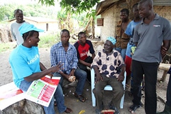 | 配布されたエボラの予防方法に関するチラシを読む住民。(リベリア) |