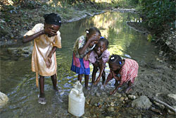 | 川で水を汲むハイチの子どもたち。 ひとつ井戸があれば、その地域に暮らす人々に大きな希望をもたらす。 |