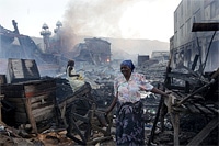 | ポルトープランスの商業地域で、自分たちの商品を回収しようとする女性。 |