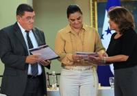 | PNPRRSのフィリップ・モラレス代表とユニセフ・ホンジュラス事務所のクリスチャン・ムンドゥアテ代表から報告書「Status of Gangs in Honduras—ホンジュラスのギャングの状況(仮)」を手渡されるロサ・エレナ・デ・ロボ ホンジュラス大統領夫人(右)。 |
