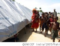 洪水被災者のための避難キャンプ。毎年の洪水の季節に備えて、ユニセフとパートナー団体は避難所、水と衛生物資を事前に手配していました。 |