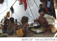 インドで最も貧しく、開発の遅れている州のひとつビハール州では、今までにおよそ36人の人々が洪水で命を落としました。周辺の村々ではおよそ1万人が土地をうばわれ、現在10キロにわたって続く土手の上で生活しています。土手は周囲をすべて水で囲まれています。