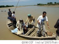 川の土手にボートで乗り着けるユニセフの職員。1万人の人々がインド・ビハール州で起きた洪水のため、住む家を追われました。 |