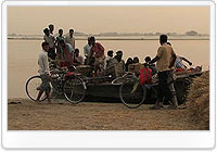 | ビハール州のコシ川を渡るために、木製ボートが使用されている。 |