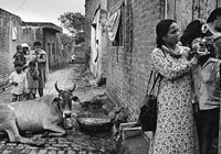 | 2001年、ムラーバーダードにあるダドゥパル村では、保健スタッフが一軒一軒家を回って子どもたちの予防接種を呼びかけた。予防接種を受け終わった家庭にはチョークで印が付けられた。 |