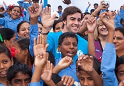 | インド・ウッタル・プラデシュ州のトゥガルプル村の子どもたちと交流するF1ドライバーのフェルナンド・アロンソ ユニセフ親善大使。アロンソ大使は、学校の水と衛生分野を視察。手洗いの重要性を訴えた。 |