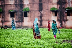 | 屋外で排せつするために桶を持って歩くインドの女性たち。トイレがないため、夜でも用を足すために家の外に出なければならず、少女や女性の安全を脅かしている。 |
