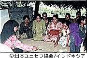 インドネシア東部のロンボク島セラ村。ここでは毎週2回、女性たちが家事や仕事から開放される夜間に、字の読み方、書き方を学ぶ教室が開かれています。ユニセフが、地域のNGOと協力し、実施している女性支援事業のひとつです。