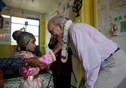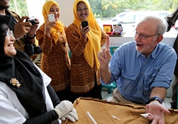 | 2月28日、バンダ・アチェの乳幼児開発センターで児童から歓迎を受けるレーク事務局長。この施設はユニセフが津波の早期復興支援で仮設の学校として建設した。 |