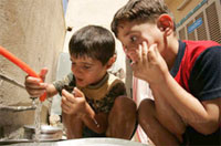 | ユニセフの支援で改善された、バクダッドの公共水道で、安全な水を飲む子どもたち。 |