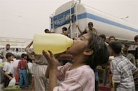| 何週間もの間、バスラの住民は水を取りに外出も、学校に通うこともできませんでした。ユニセフが資金援助した水タンク作戦で、何週間も外出禁止令と武力衝突が続いたバスラの街に水が届けられています。(2003年撮影) |