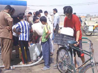 | 外出禁止令のなかでも、ユニセフのタンカーによる水配給は続いています。 |