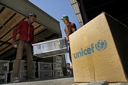 | イラク北部の町アルビルにあるユニセフの倉庫で支援物資のレクレーションキットをトラックに積むスタッフ |