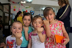 | ユニセフはポリオキャンペーンを実施。ポリオの予防接種を受けたという、紫色の印を見せる子どもたち。 |