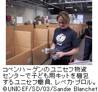 ユニセフは6月の終わりに、ユニセフのコペンハーゲンの物資センターで、毎週2,500キットという今までにない速さで1万5,000もの子ども用キットをつくりはじめました。ひとつのキットには23種類の品目が入っています。