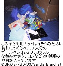 中国、インド、トルコの3つの企業がこれらのキットを生産するために選ばれました。ユニセフは時間どおりに、そして安価で良質のキットが確実に配送されることを重視しています。企業はキットをバグダッドへ直接送り、それをユニセフ・イラク事務所やイラク教育省が国全体に分配することになります。