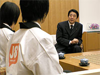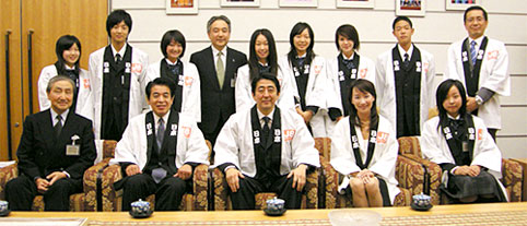 | 安倍総理(中央)を囲むJ8日本代表チームとアグネス・チャン日本ユニセフ協会大使(安倍総理右)、下村内閣官房副長官(同左)、J8共催者の堀田モルガン・スタンレー証券会長(写真左前)と早水日本ユニセフ協会専務理事(写真中央後) |