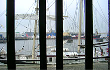 | 事務所の窓から。ちょうど今船が見える場所あたりに、J8の帆船が停泊する予定 |