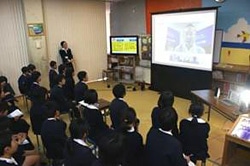 | 「今日学んだことを、是非、お友達や家族にも伝えてくださいね」。22日の授業には、最大10箇所の“中継”が可能なグーグル・ハングアウトの特性を活かし、スーダン・ダルフールでの勤務経験もあるユニセフ職員の斉藤洋之氏も、ユニセフ東京事務所から参加。世界的にも、最も厳しい状況に置かれているアフリカの子どもたちへの支援を訴えました。 |