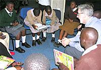 | 国連の「子どもに対する暴力に関する調査」が東部アフリカ地域で発表にあたり、子どもたちとのグループ・ディスカッションに加わる、同研究主任担当官のパウロ・セルジオ・ピニュイロ博士。 |