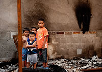 | キルギス南部、ジャラル・アバドの全焼した家の“中”に立つアマンバエブさんの子どもたち。 |