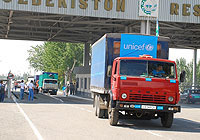 | ウズベキスタンとキルギスの国境にあるドストリク検問所を通過し、オシに向かうユニセフが支援した緊急支援物資を載せたトラック。 |
