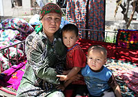 | キルギスのオシ南部のフルカト地区にあった焼失した自宅の前に座るグルナラ・コズィバエバさんと娘のアクマラルちゃん(4歳)、息子のナルベクちゃん(2歳)。コズィバエバさんの家は、民族間衝突の混乱の中、焼失しました。 |