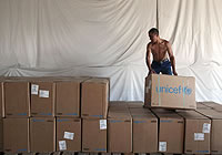| オシ南部の都市で、トラックから積荷を降ろすユニセフのスタッフ。ウズベキスタン政府とキルギス政府との数日間にわたる交渉後、隣国のウズベキスタンに避難した人々のための支援物資を載せたトラックが到着しました。 |