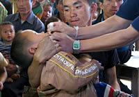 | ユニセフの支援で実施された「子ども保健の日キャンペーン」。ラオスの山奥のヒン・パン村で、ビタミンAを投与される男の子。 |