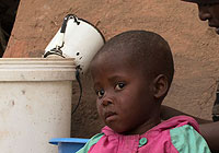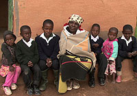 | レソトのマトシェング村で祖母のマンフォ・トゥマネさんと一緒に座る女の子。母親は10年前に亡くなった。 |