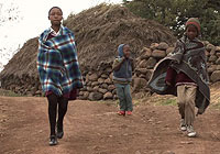 | レソトのマトシェング村のほこりっぽい道を歩く子どもたち。 |