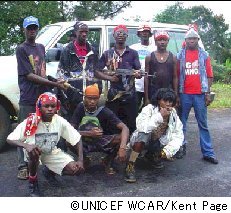 今年6月〜8月の紛争激化の前に(リベリアでは、第1次世界大戦、第2次世界大戦、第3次世界大戦として知られています)、ユニセフは兵士や性の奴隷として約1万5000人の子どもが紛争に巻き込まれていると推計しました。2003年6月には子どもの強制的な徴兵とレイプや性的暴力に関して、急激な深刻化が予測されました。ある武装グループは70%までが子ども兵士であると信じられており、そのうち80%が武装しています。
