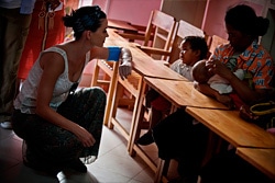 また、アンドロランガ村の栄養センターでは、マダガスカルのもうひとつの深刻な問題−慢性栄養不良への取組みも視察。マダガスカルの子どもの半分は慢性的に栄養不良で、世界で栄養不良が最も深刻な6ヵ国のひとつになっています。ユニセフは、生後6ヵ月間は母乳のみで育てる完全母乳育児などを推奨しています。