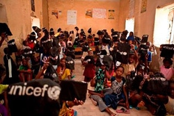 | 北部トンブクトゥのある小学校での様子。生徒数750人に対し、学校にある机はわずか50。 「バック・トゥ・スクール・キャンペーン」の第一段階として、ユニセフは、学用品やバッグなどを提供。また、地元でいすを製作し、地元経済にも貢献します。 |